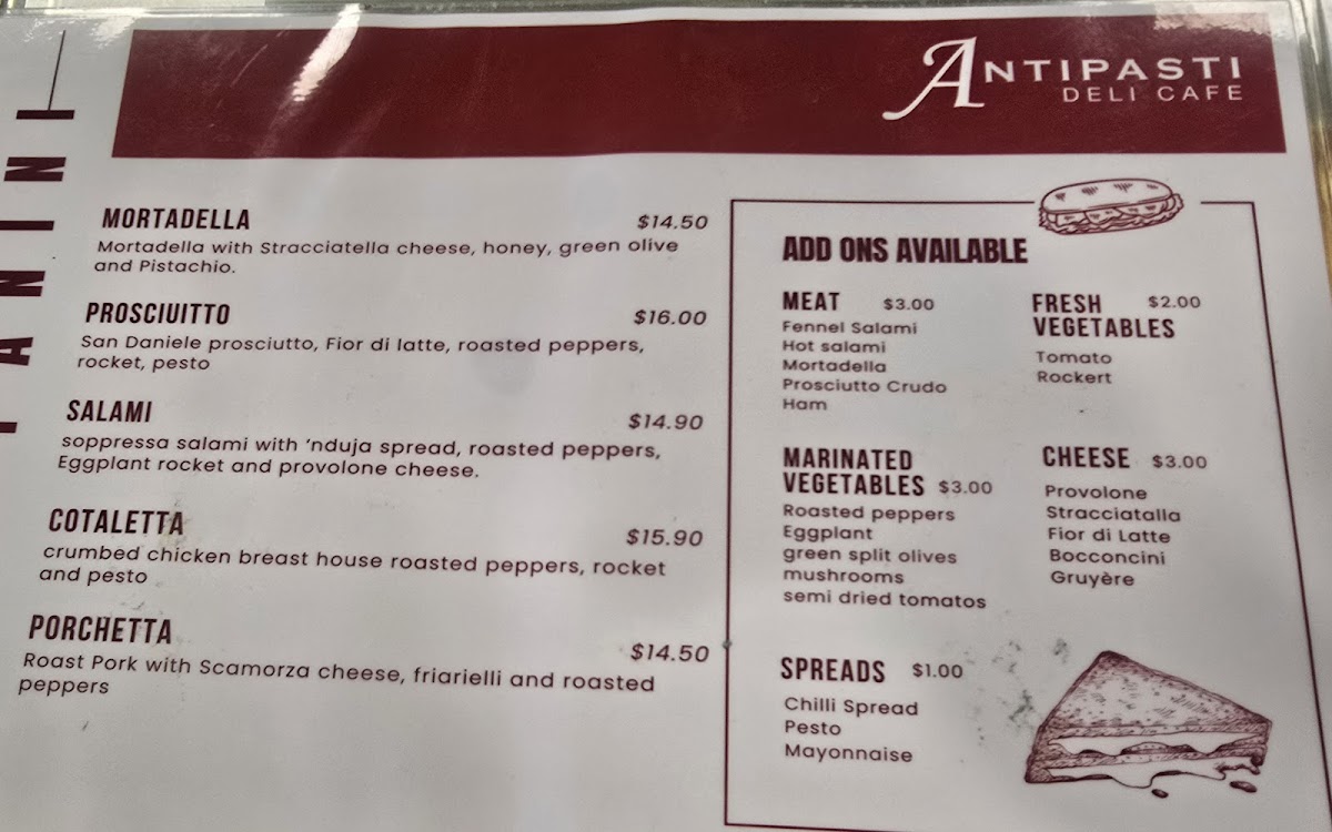 The menu at Antipasti Deli & Cafe offers a delightful mix of comfort food and Mediterranean-inspired dishes. For a light and fresh start, the Greek Salad is available, perfect for a healthy option. The dessert selection is tempting, featuring Cherryripe Slice, Caramel Slice, MacaroonHedgehog Slice, and the rich Carrot Cake. If you're in the mood for something savory, their pies, sausage rolls, and pasties are a great choice, with offerings like Pie, Sausage Roll, Vegetable Pasty, and Cornish Pasty. Toastie lovers will find a variety of options, including Toasted Sandwich Ham and Cheese, BLT, Mortadella Toastie, Cheese Tomato Toastie, and the indulgent Reuben Toastie. The focaccias stand out with choices such as Salami Focaccia, Antipasto Focaccia, Prosciutto Focaccia, and the hearty Chicken Schnitzel Focaccia. For those seeking something heartier, the pasta options include Beef Tortellini Carbonara and classic Lasagna. The Arancini Balls, available in Bolognese and Pesto and Goats Cheese, provide a flavorful, bite-sized treat. Pizza enthusiasts can enjoy the classic Margherita or the savory Capricciosa. Of course, a visit wouldn’t be complete without a coffee, with choices ranging from Espresso to Cappuccino, Hot Chocolate, and even Chai Latte or Cafe Latte. With such a diverse and tempting menu, Antipasti Deli & Cafe is sure to satisfy a wide range of tastes.